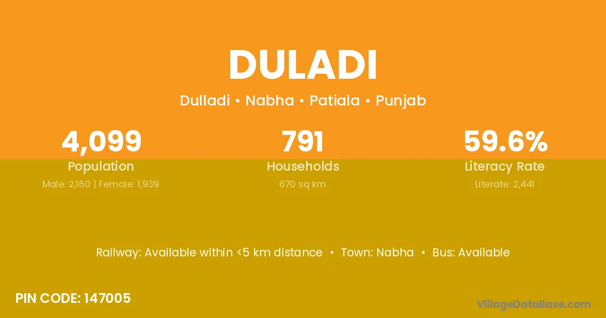 According to Census 2011 information, the village code of Duladi village is 147005.