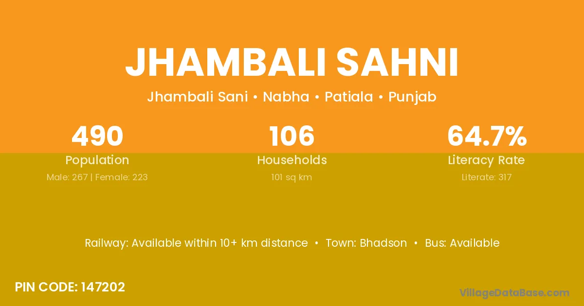 Jhambali Sahni village has a total population of 490 people, of which 267 are males and 223 are females.