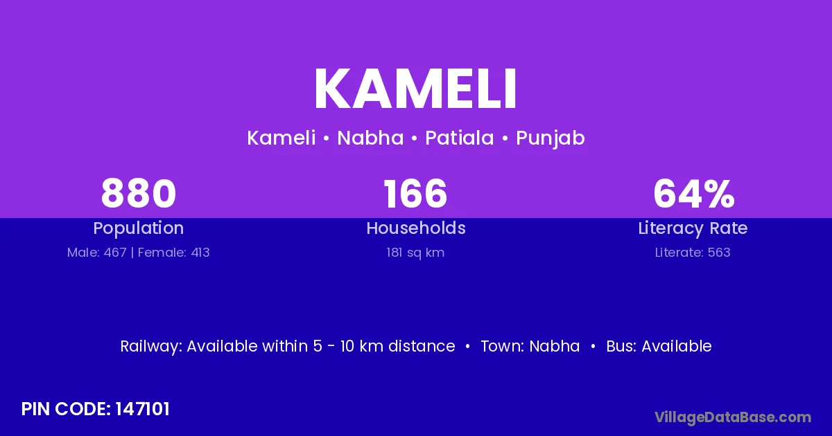 Kameli village has a total population of 880 people, of which 467 are males and 413 are females.