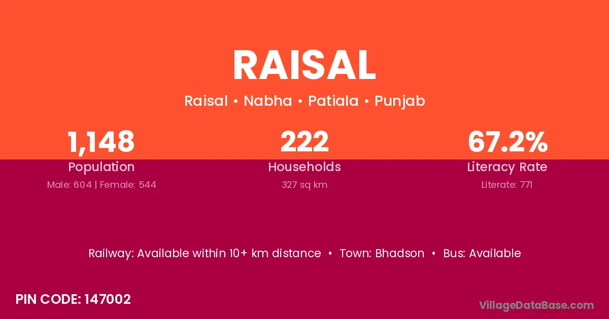 Raisal village has a total population of 1,148 people, of which 604 are males and 544 are females.