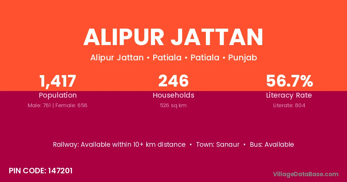Alipur Jattan village has a total population of 1,417 people, of which 761 are males and 656 are females.
