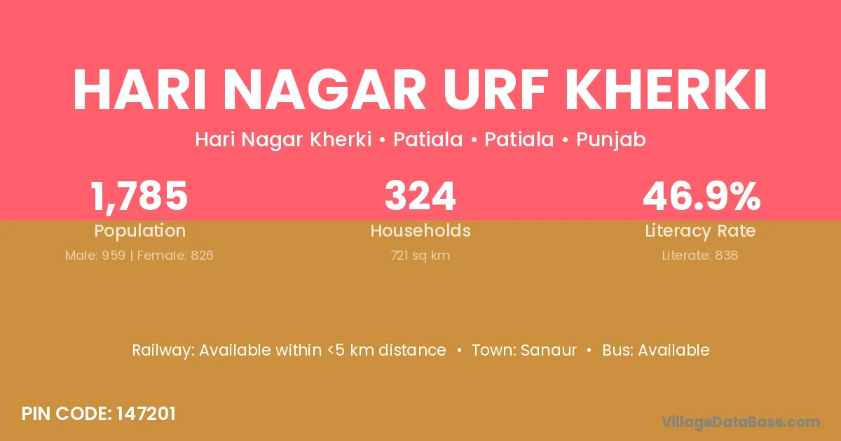 Hari Nagar Urf Kherki village has a total population of 1,785 people, of which 959 are males and 826 are females.