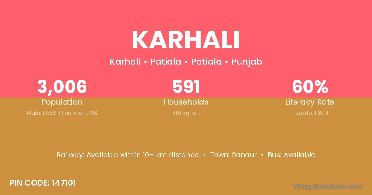 Karhali village has a total population of 3,006 people, of which 1,588 are males and 1,418 are females.