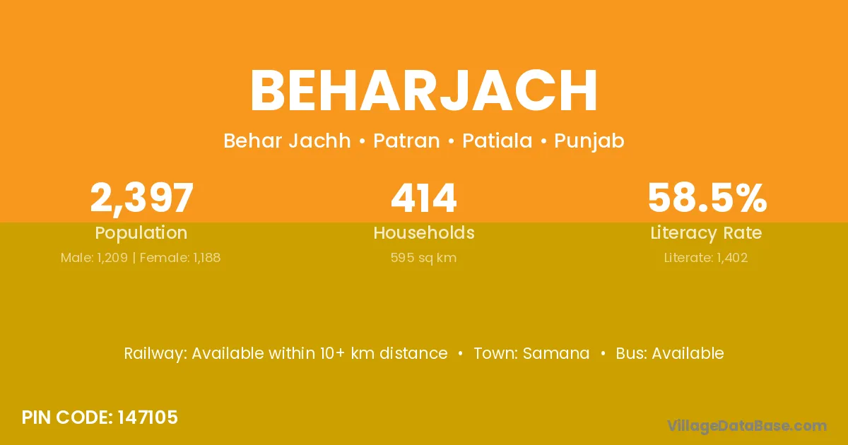 Beharjach village has a total population of 2,397 people, of which 1,209 are males and 1,188 are females.