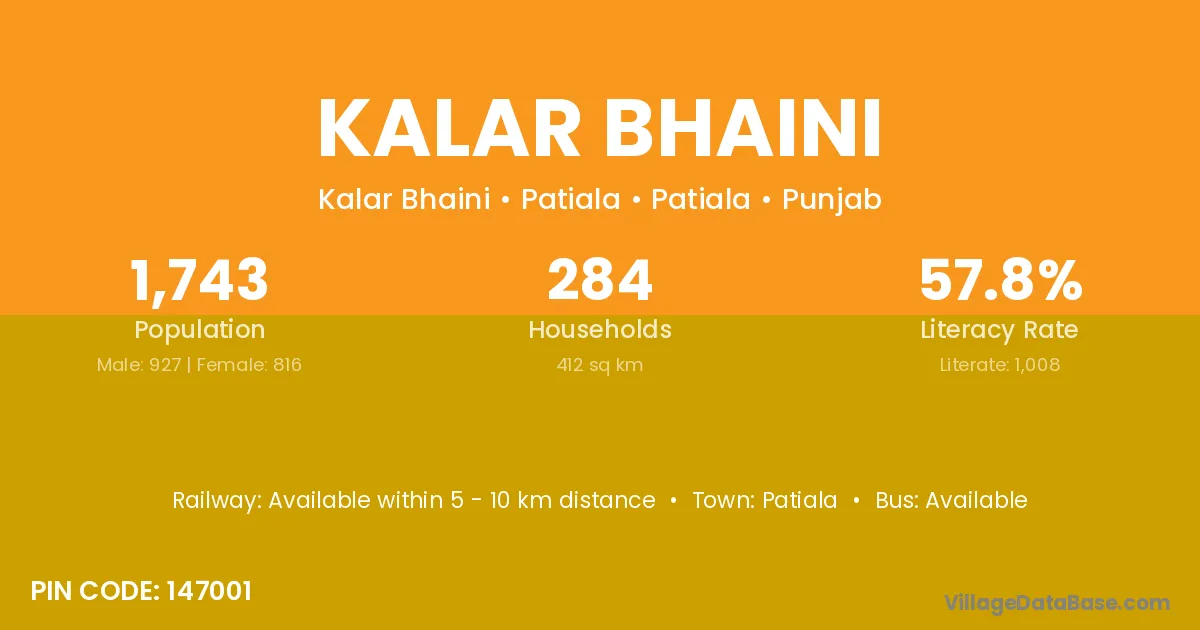 According to Census 2011 information, the village code of Kalar Bhaini village is 147201.