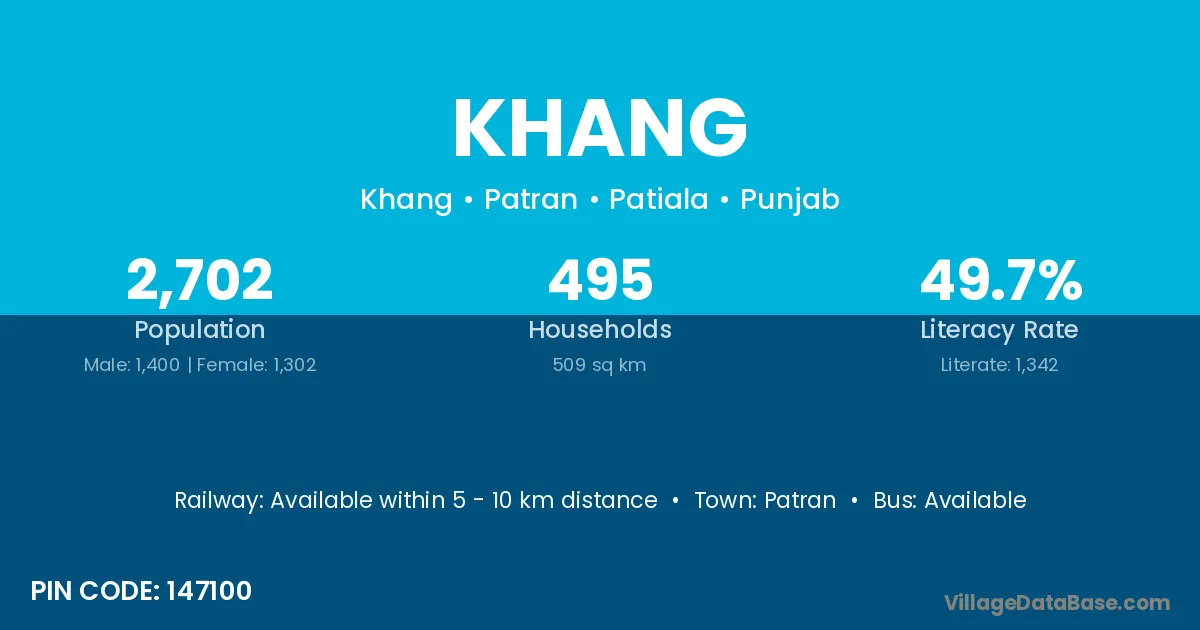 The literacy rate of Khang village is 49.67%. Male literacy stands at 57.29% and female literacy at 41.47%.