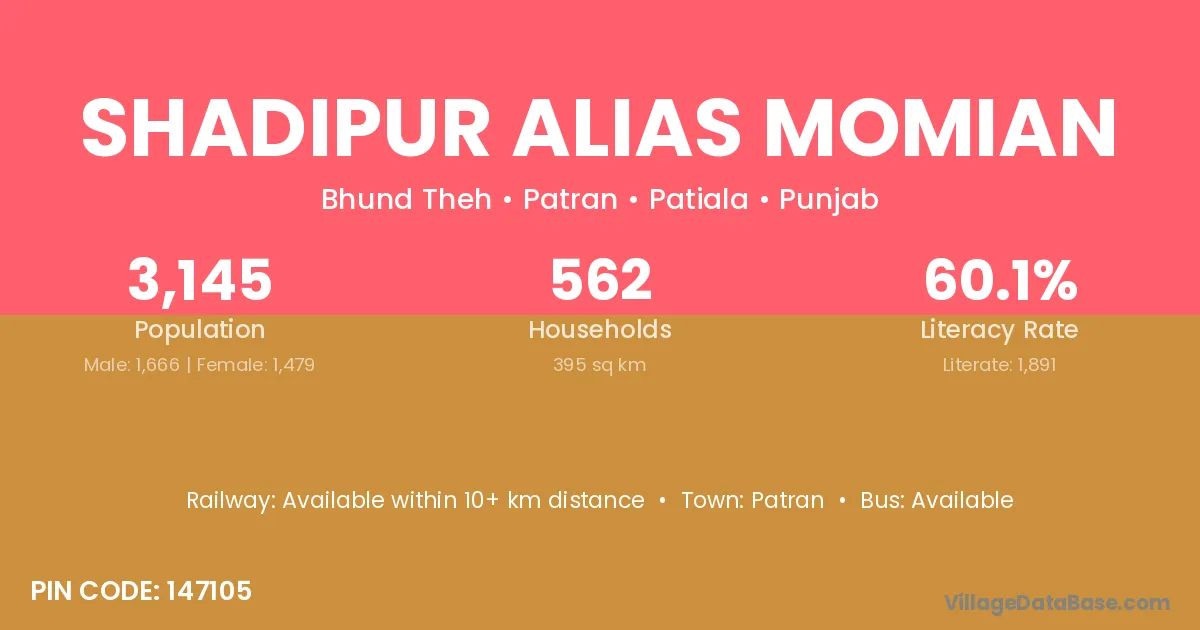 Shadipur Alias Momian village has a total population of 3,145 people, of which 1,666 are males and 1,479 are females.