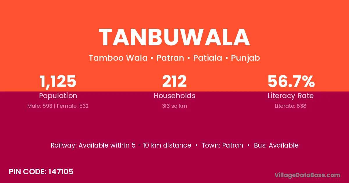 Tanbuwala village has a total population of 1,125 people, of which 593 are males and 532 are females.