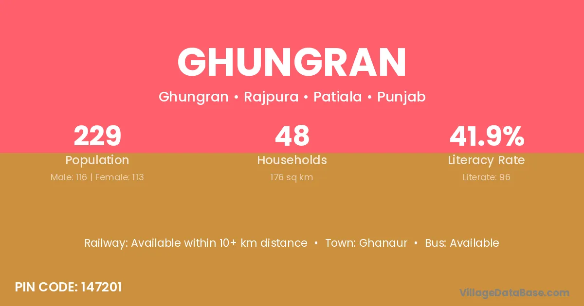Ghungran village has a total population of 229 people, of which 116 are males and 113 are females.