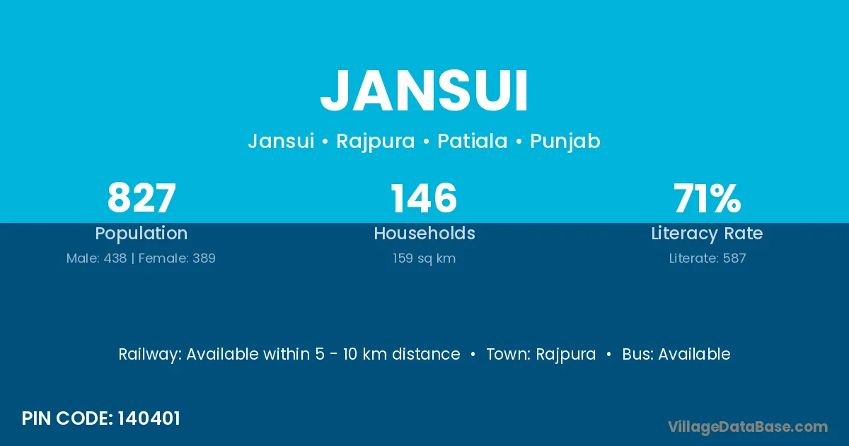 Jansui village has a total population of 827 people, of which 438 are males and 389 are females.