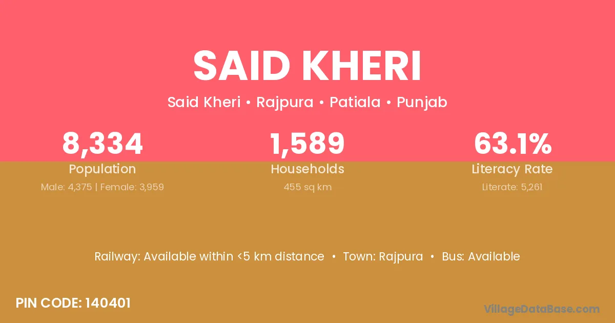 Said Kheri village has a total population of 8,334 people, of which 4,375 are males and 3,959 are females.