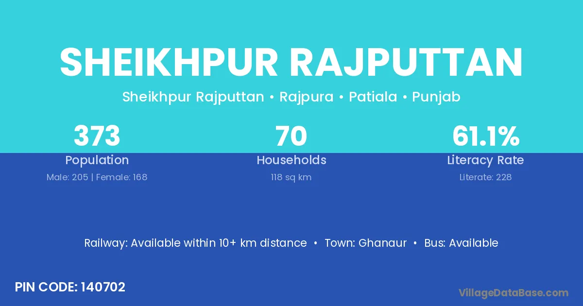 Sheikhpur Rajputtan village has a total population of 373 people, of which 205 are males and 168 are females.