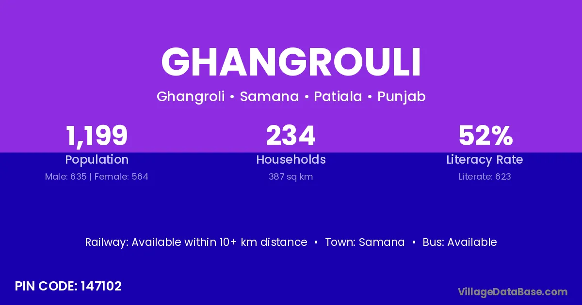 According to Census 2011 information, the village code of Ghangrouli village is 147102.