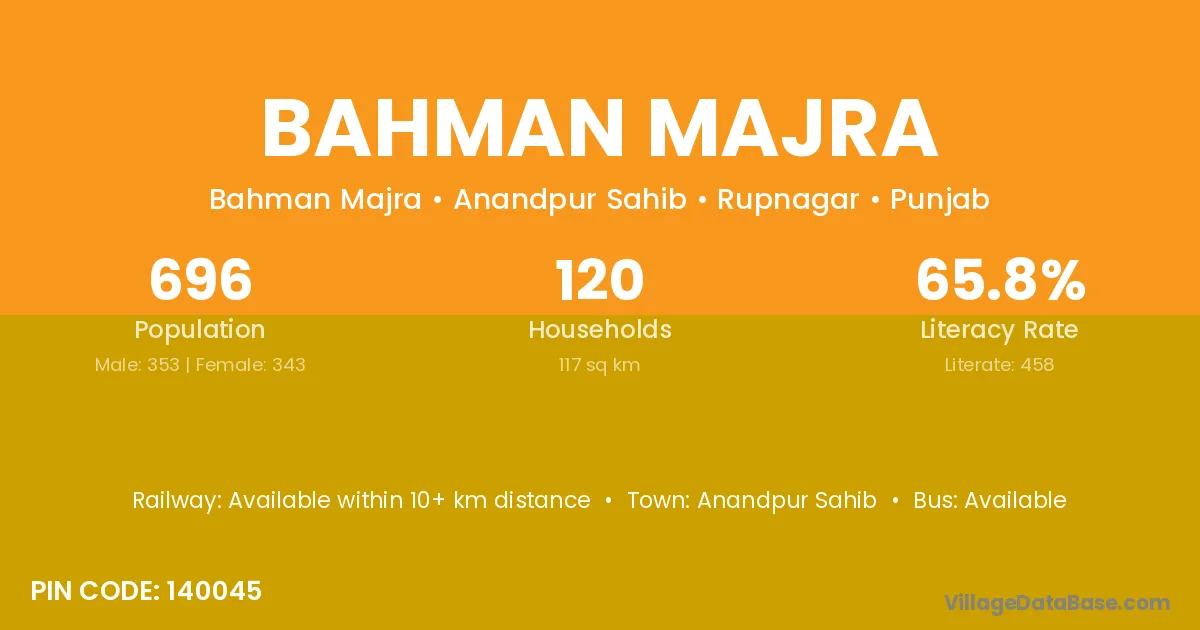 Bahman Majra village has a total population of 696 people, of which 353 are males and 343 are females.