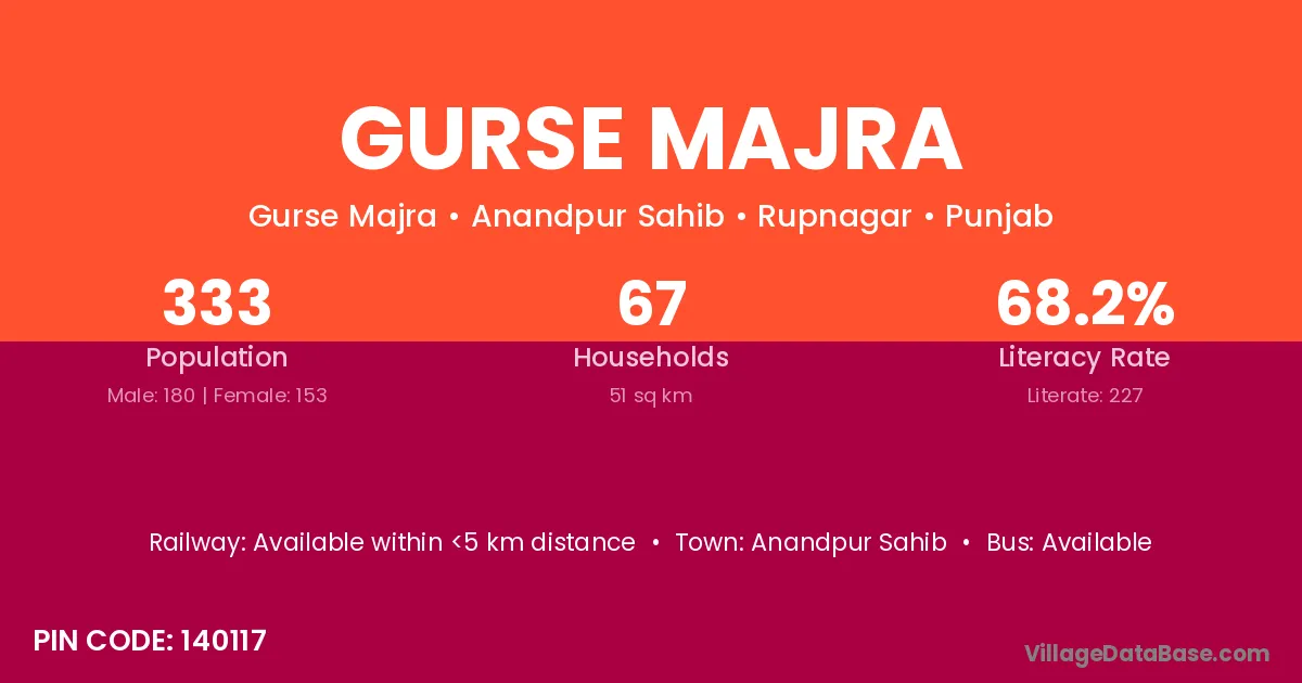 Gurse Majra village has a total population of 333 people, of which 180 are males and 153 are females.