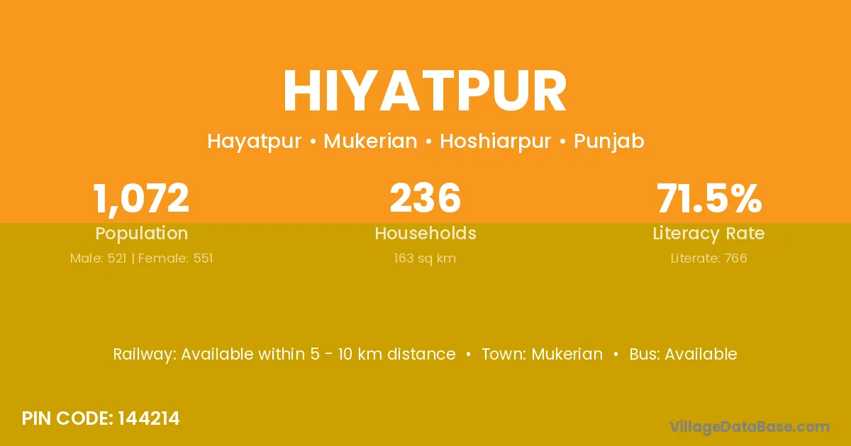 Hiyatpur village has a total population of 1,359 people, of which 697 are males and 662 are females.