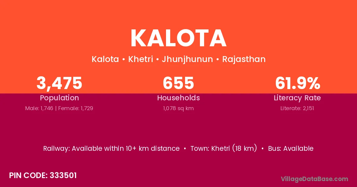 The literacy rate of Kalota village is 75.44%. Male literacy stands at 79.58% and female literacy at 71.22%.