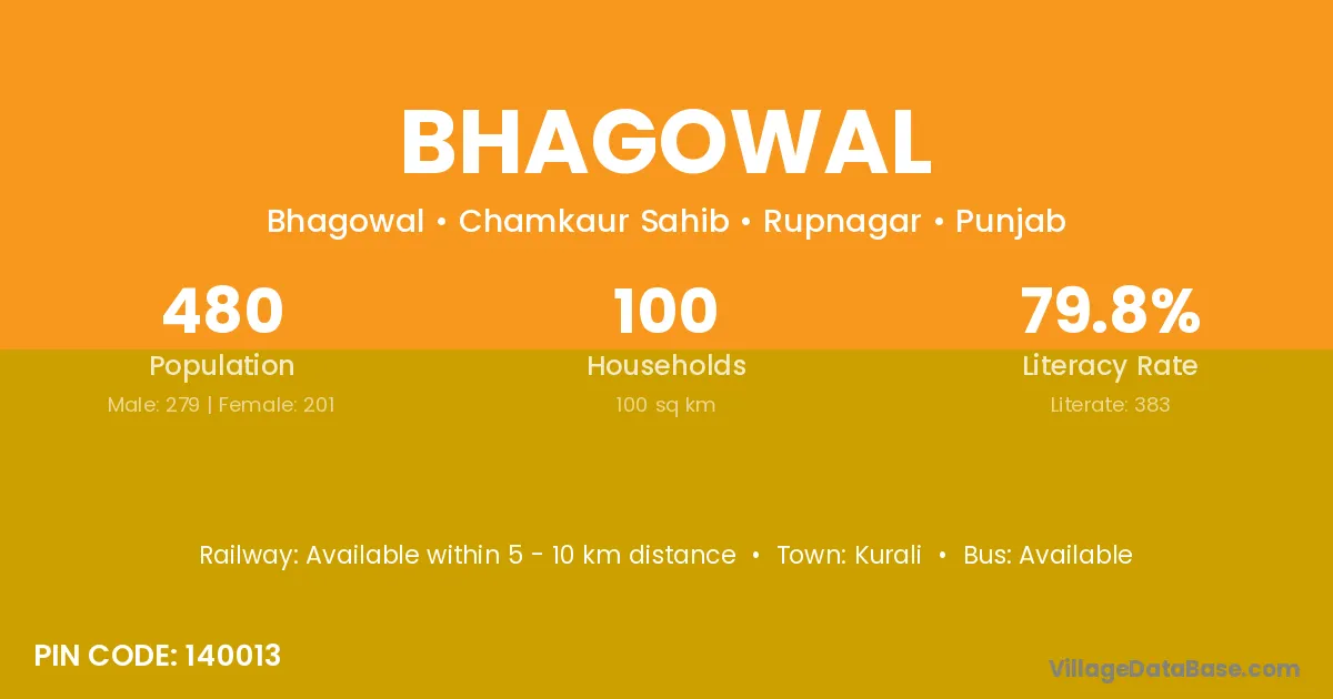 Bhagowal village has a total population of 480 people, of which 279 are males and 201 are females.