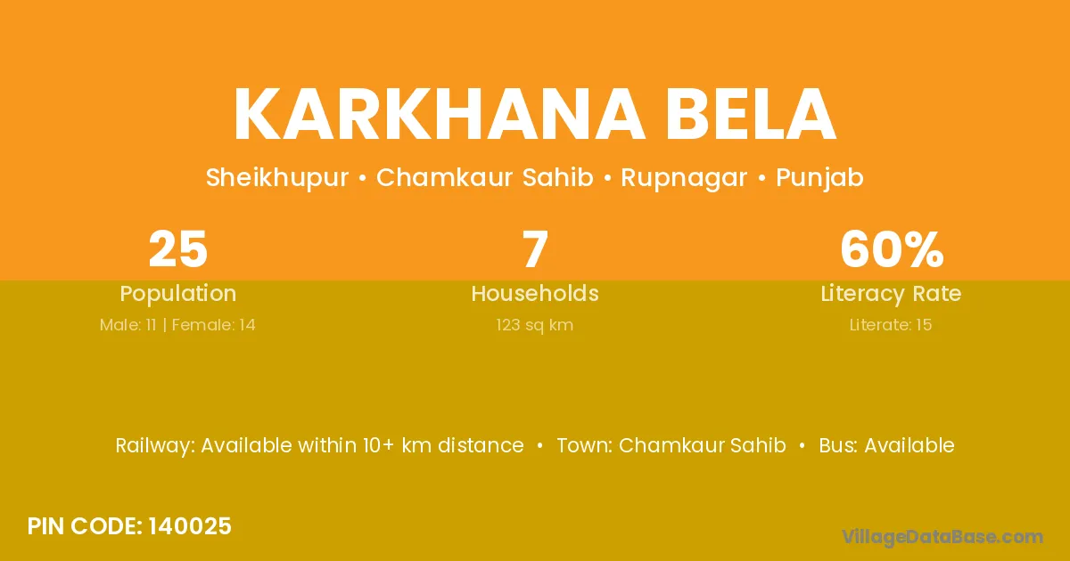 Karkhana Bela village has a total population of 25 people, of which 11 are males and 14 are females.