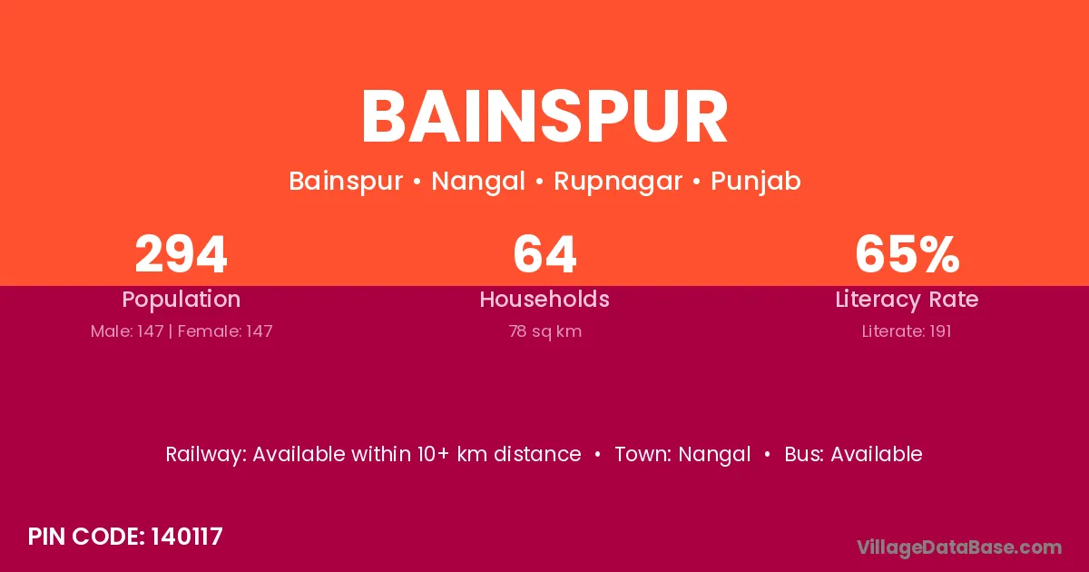 Bainspur village has a total population of 294 people, of which 147 are males and 147 are females.