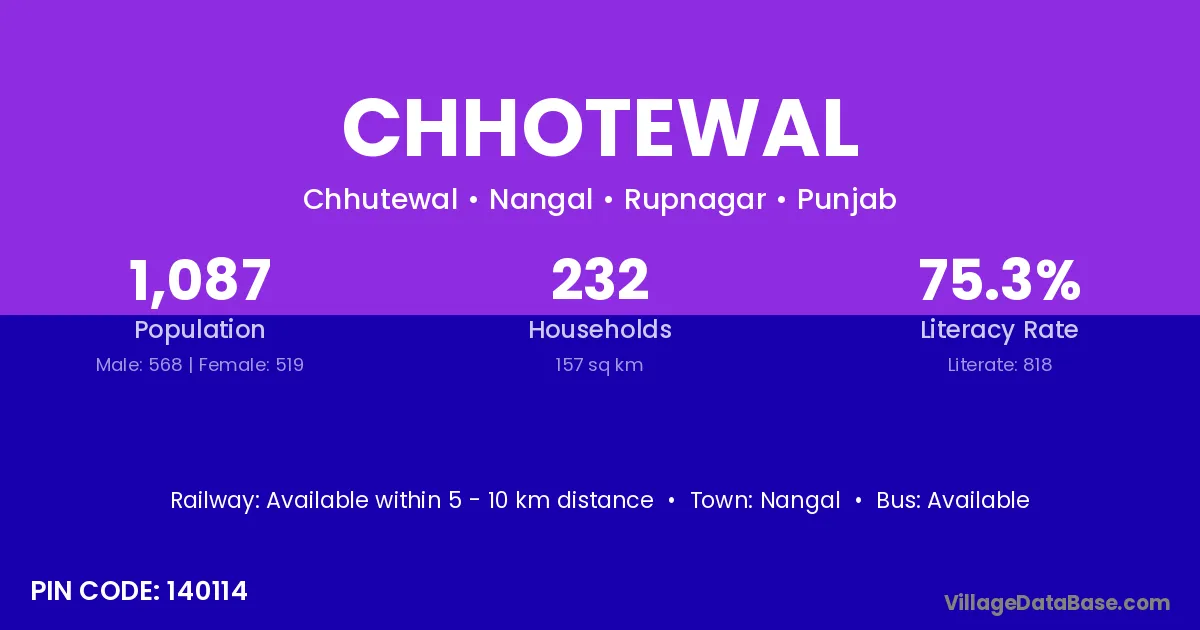 Chhotewal village has a total population of 1,087 people, of which 568 are males and 519 are females.