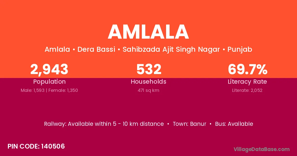 Amlala village has a total population of 2,943 people, of which 1,593 are males and 1,350 are females.