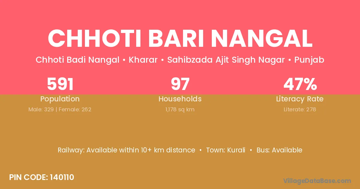 Chhoti Bari Nangal village has a total population of 591 people, of which 329 are males and 262 are females.