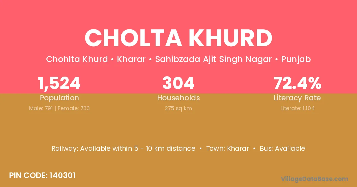 Cholta Khurd village has a total population of 1,524 people, of which 791 are males and 733 are females.