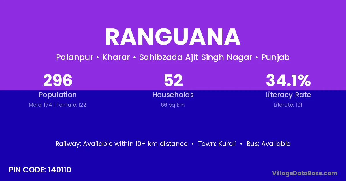 Ranguana village has a total population of 296 people, of which 174 are males and 122 are females.