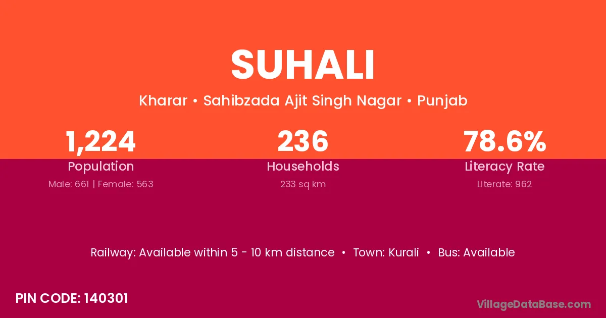 Suhali village has a total population of 1,224 people, of which 661 are males and 563 are females.