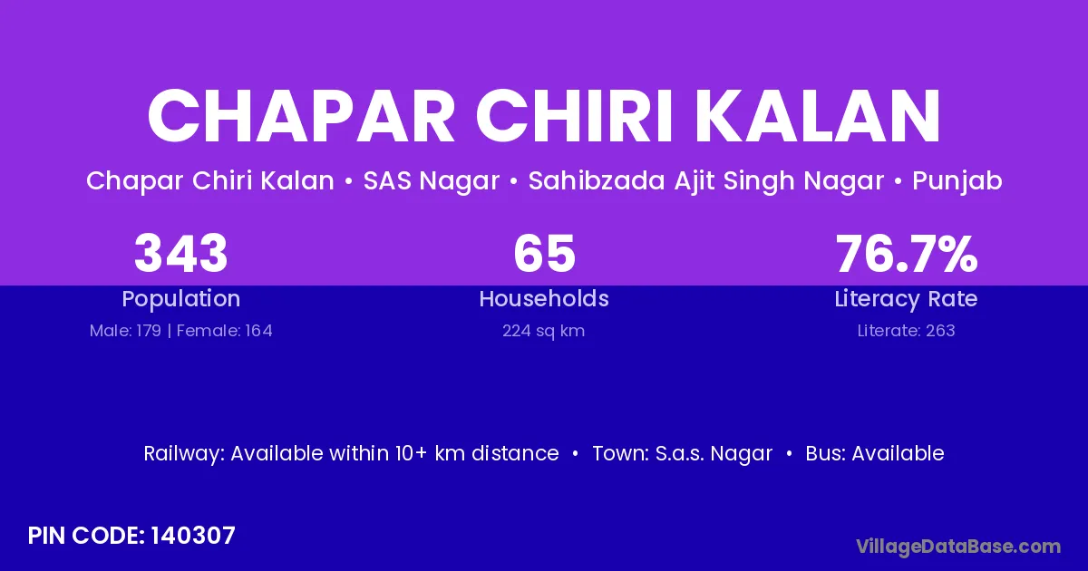 Chapar Chiri Kalan village has a total population of 343 people, of which 179 are males and 164 are females.