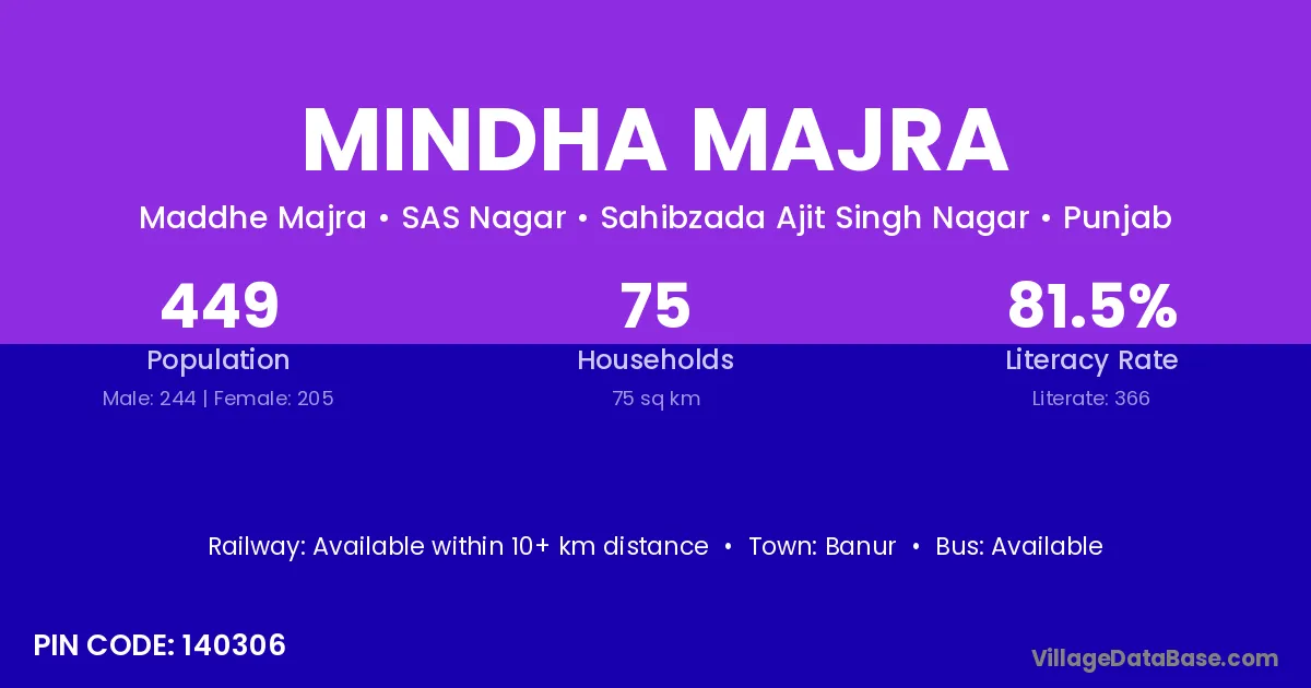 Mindha Majra village has a total population of 449 people, of which 244 are males and 205 are females.