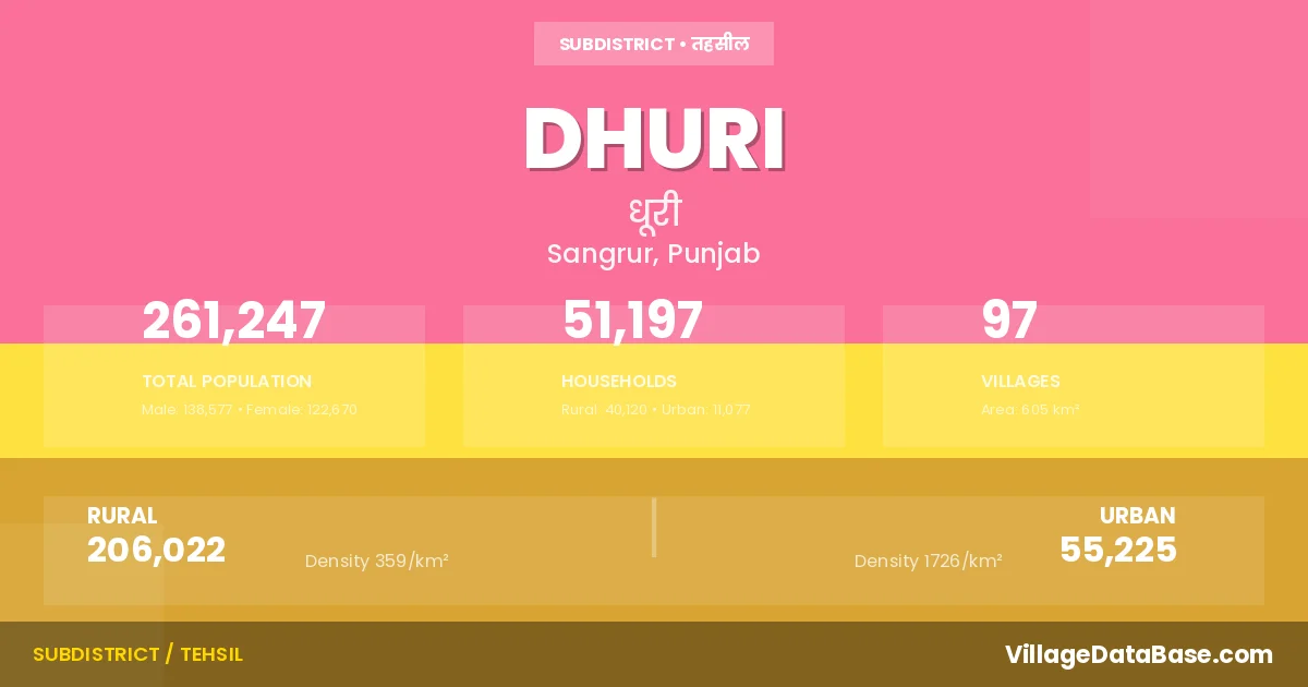 According to the 2011 census The total area of Dhuri Tehsil is 605 km², with a population of 261247 people. The population density is 432 inhabitants per square kilometre, and there are approximately 51197 houses in the sub district.