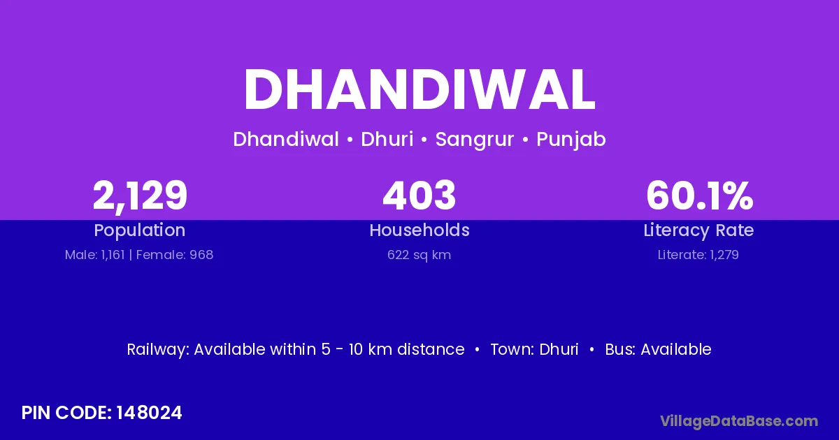 Dhandiwal village has a total population of 2,129 people, of which 1,161 are males and 968 are females.