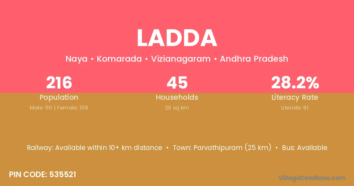 The literacy rate of Ladda village is 61.90%. Male literacy stands at 66.49% and female literacy at 56.45%.