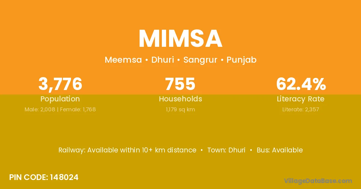 Dhuri is the nearest town to Mimsa village for major economic activities