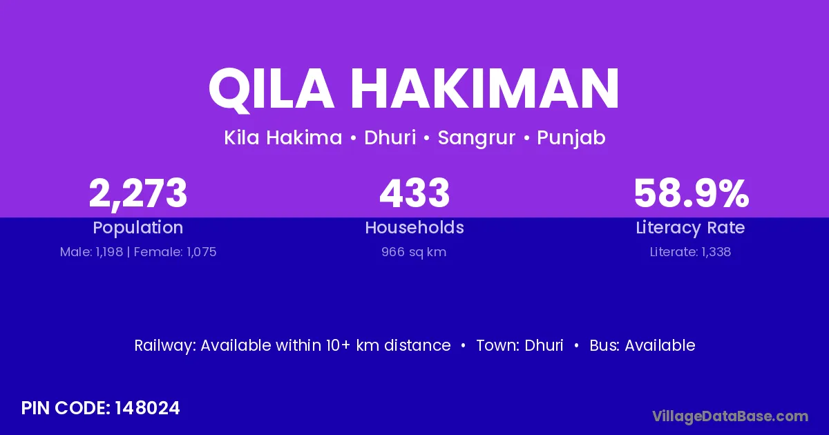 Dhuri is the nearest town to Qila Hakiman village for major economic activities