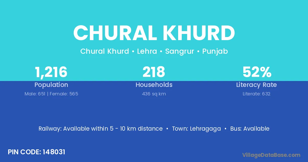 Chural Khurd village has a total population of 1,216 people, of which 651 are males and 565 are females.
