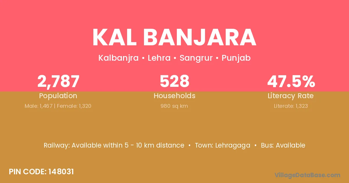 Kal Banjara village has a total population of 2,787 people, of which 1,467 are males and 1,320 are females.