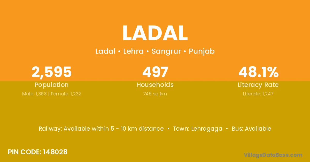 Ladal village has a total population of 2,595 people, of which 1,363 are males and 1,232 are females.
