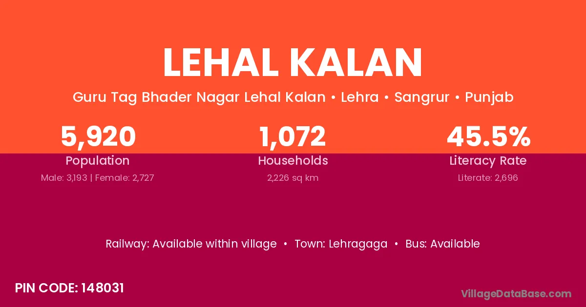 Lehal Kalan village has a total population of 5,920 people, of which 3,193 are males and 2,727 are females.