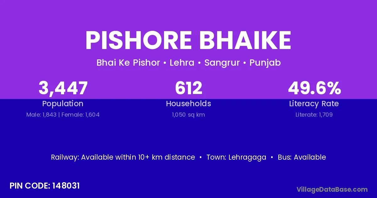 Pishore Bhaike village has a total population of 3,447 people, of which 1,843 are males and 1,604 are females.