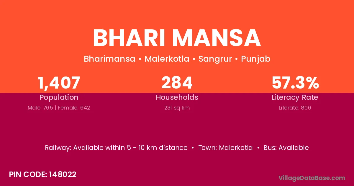 Bhari Mansa village has a total population of 1,407 people, of which 765 are males and 642 are females.