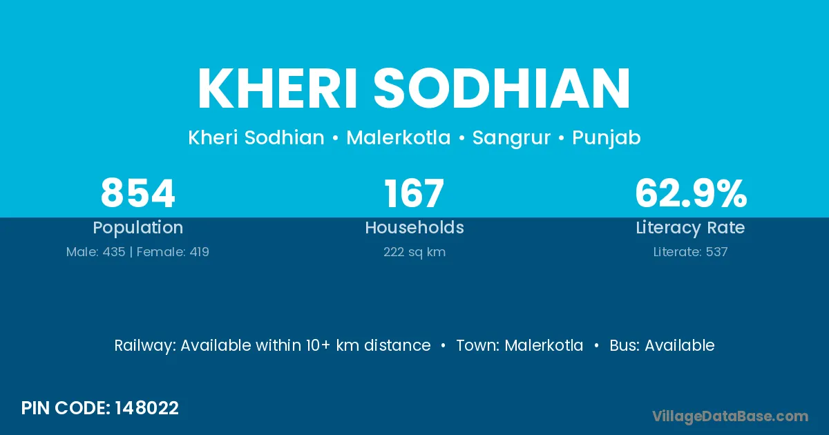 According to Census 2011 information, the village code of Kheri Sodhian village is 148022.