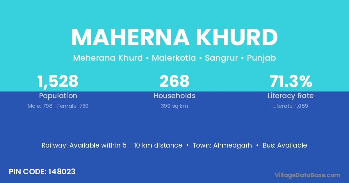 Maherna Khurd village has a total population of 1,528 people, of which 798 are males and 730 are females.