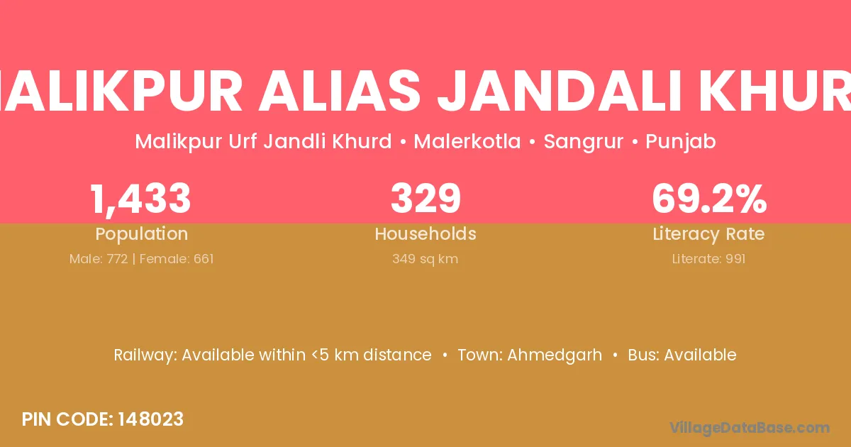 According to Census 2011 information, the village code of Malikpur Alias Jandali Khurd village is 148023.