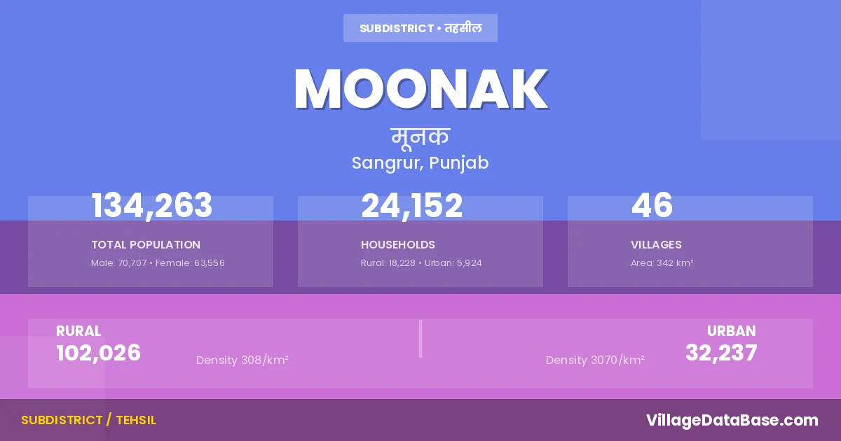 According to the 2011 census The total area of Moonak Tehsil is 342 km², with a population of 134263 people. The population density is 392 inhabitants per square kilometre, and there are approximately 24152 houses in the sub district.