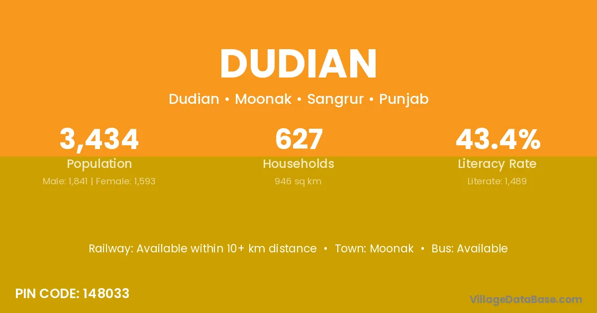 Moonak is the nearest town to Dudian village for major economic activities