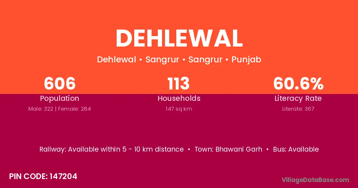 Dehlewal village has a total population of 606 people, of which 322 are males and 284 are females.