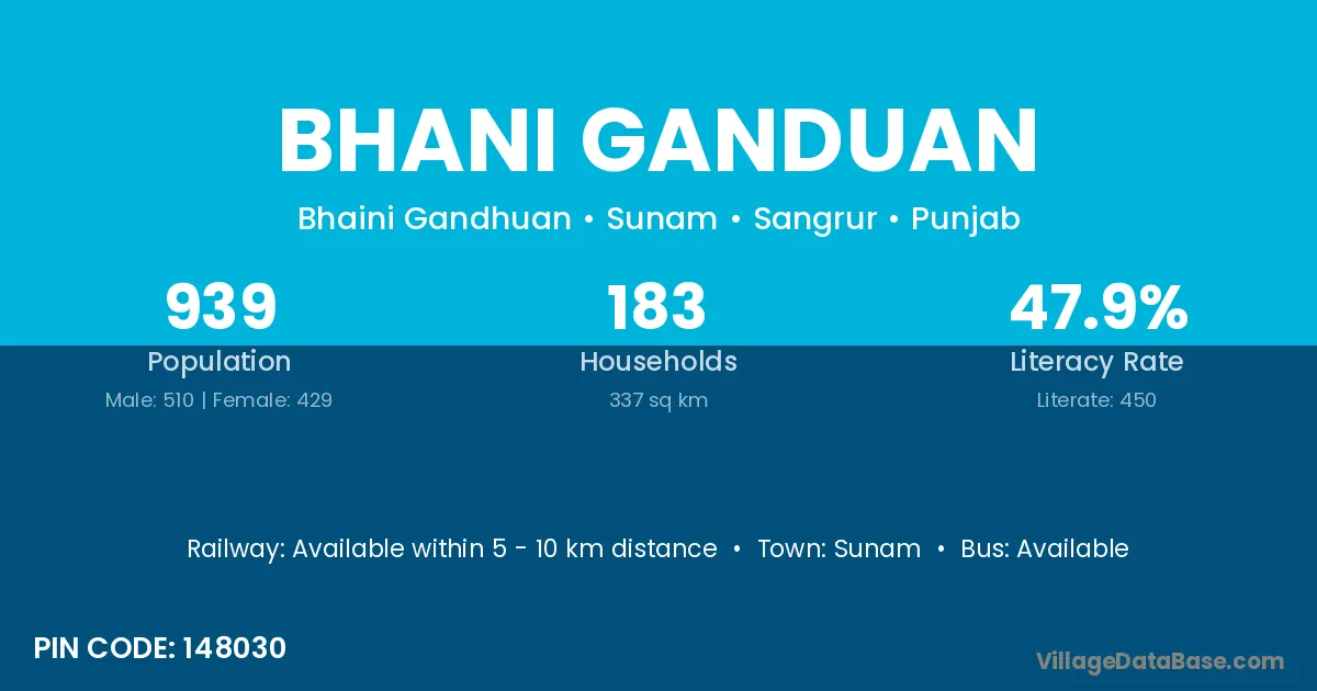 Bhani Ganduan village has a total population of 939 people, of which 510 are males and 429 are females.